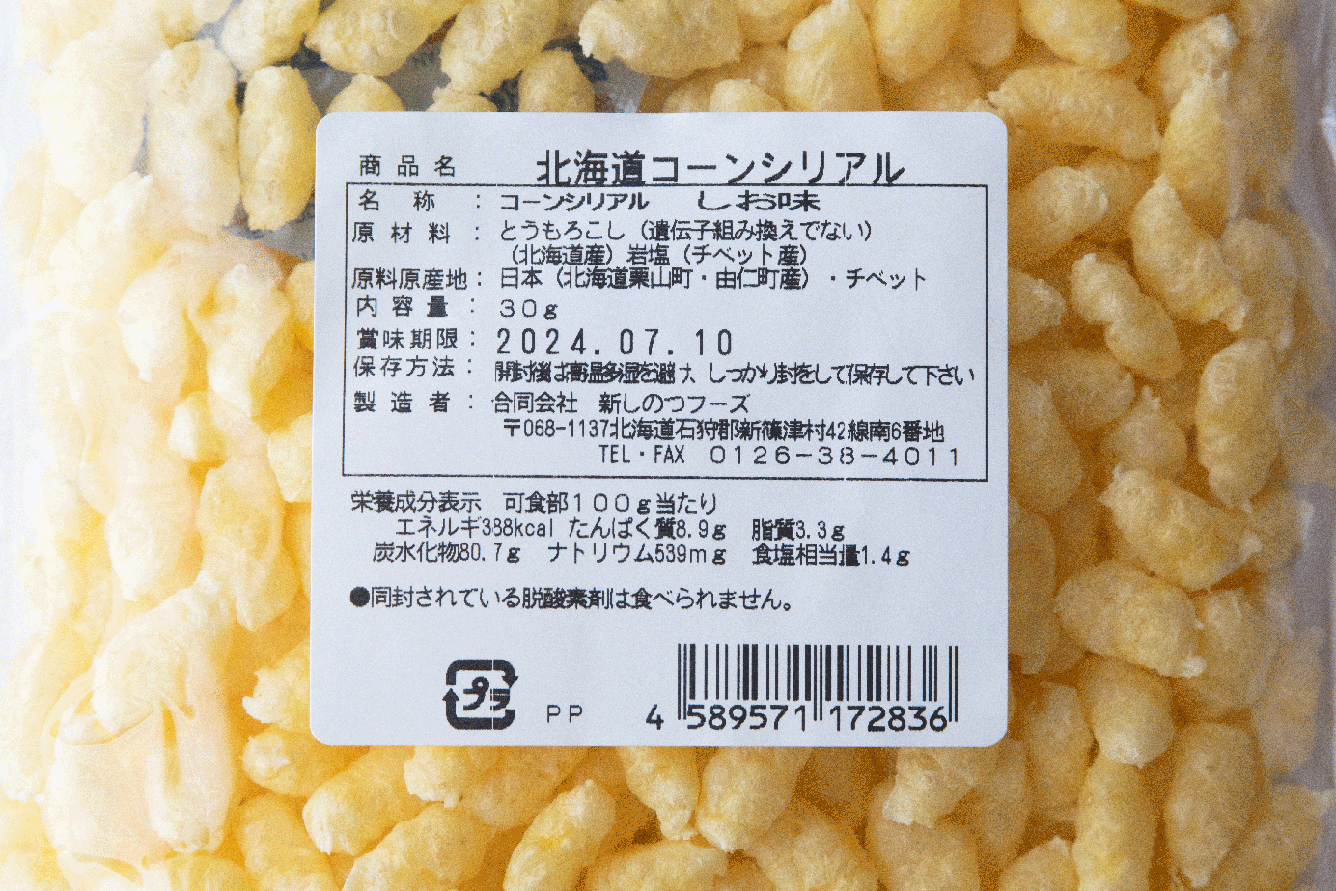 原材料はとてもシンプル。北海道産コーングリッツだけ。(コーングリッツとは、乾燥させたトウモロコシの皮や胚芽を取り除き、胚乳の部分を粗く粉砕したもの。)自然な甘みと素材の味を楽しめるシリアルです。