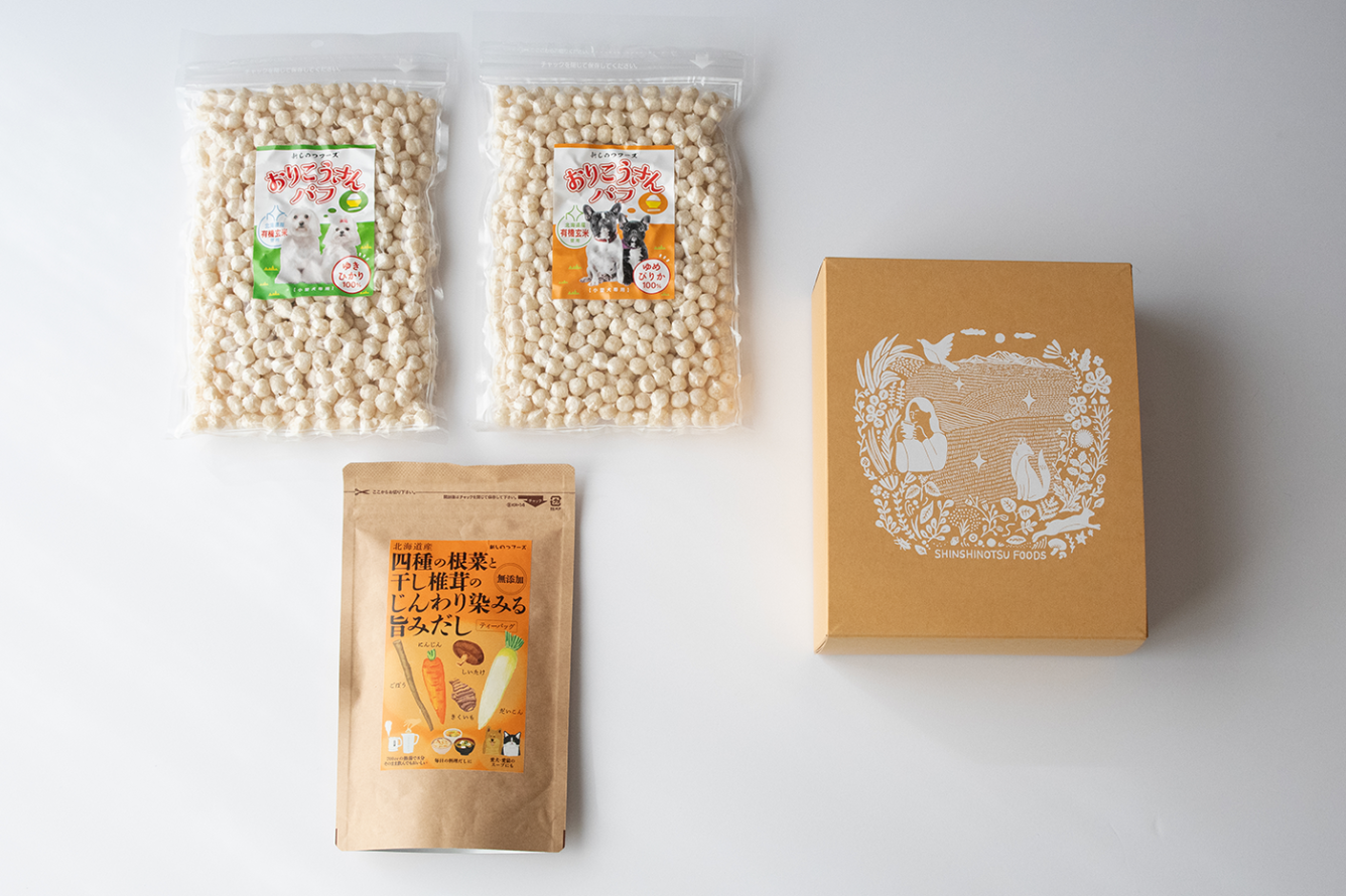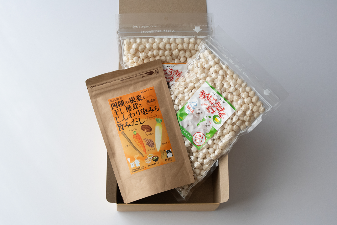 ワンちゃんのためのお米のパフ、人も一緒に楽しめるだしパックをギフトセットにしました。